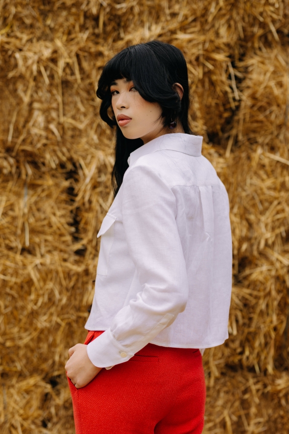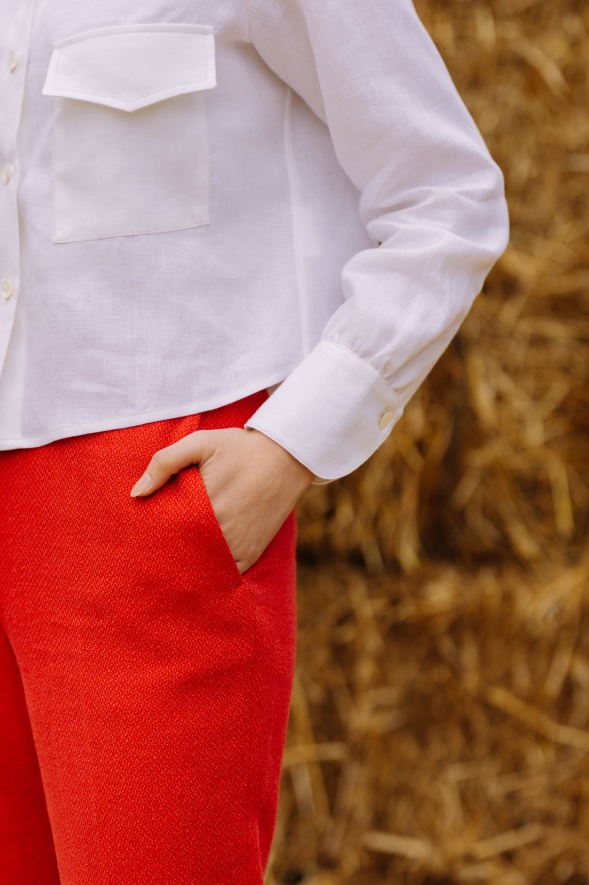 CAMISA DE LINHO COM PESPONTOS COM LINHA BRILHANTE. BOLSOS DE PALAS NO PEITO. MACHO E ESCAPULÁRIO NA COSTA.